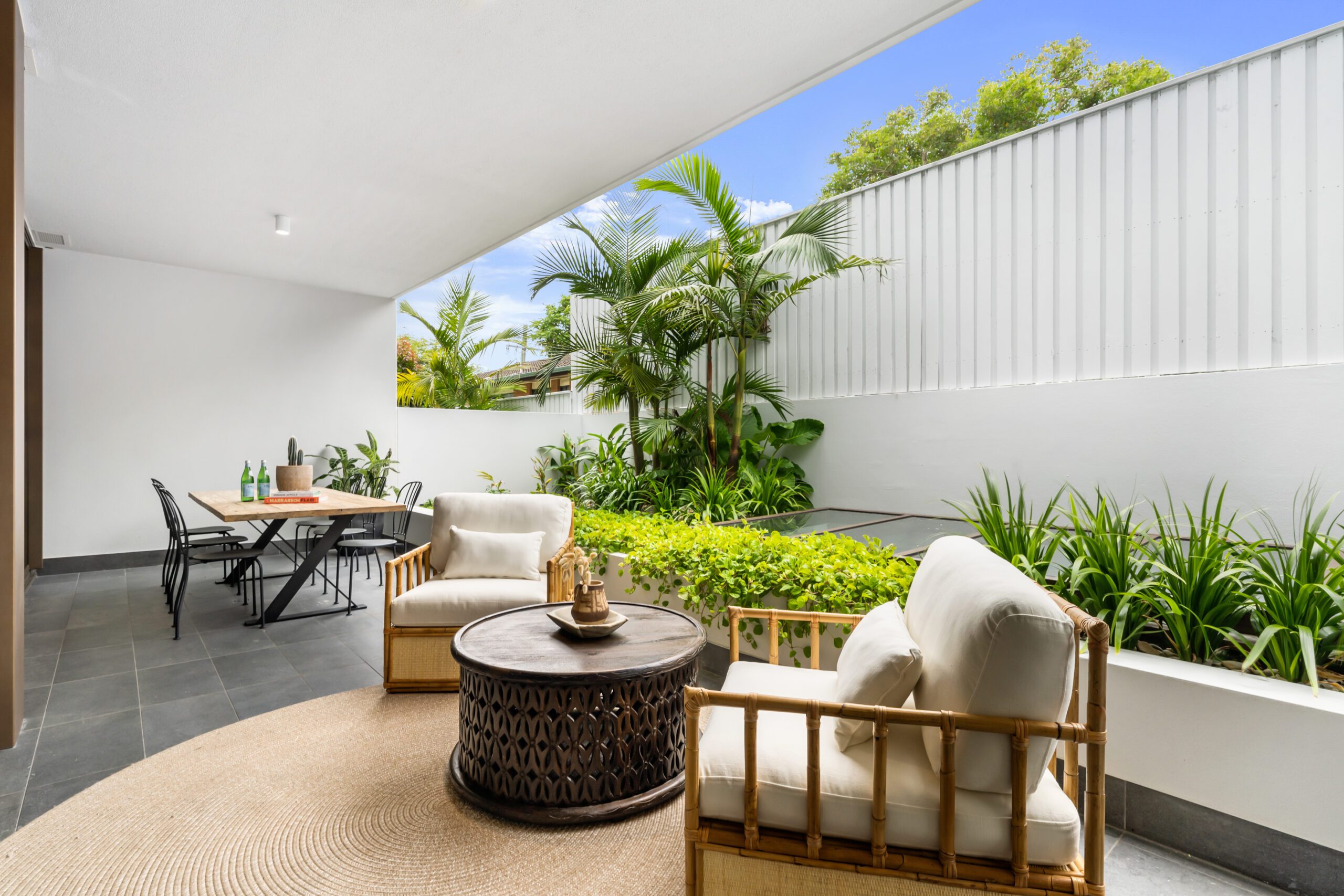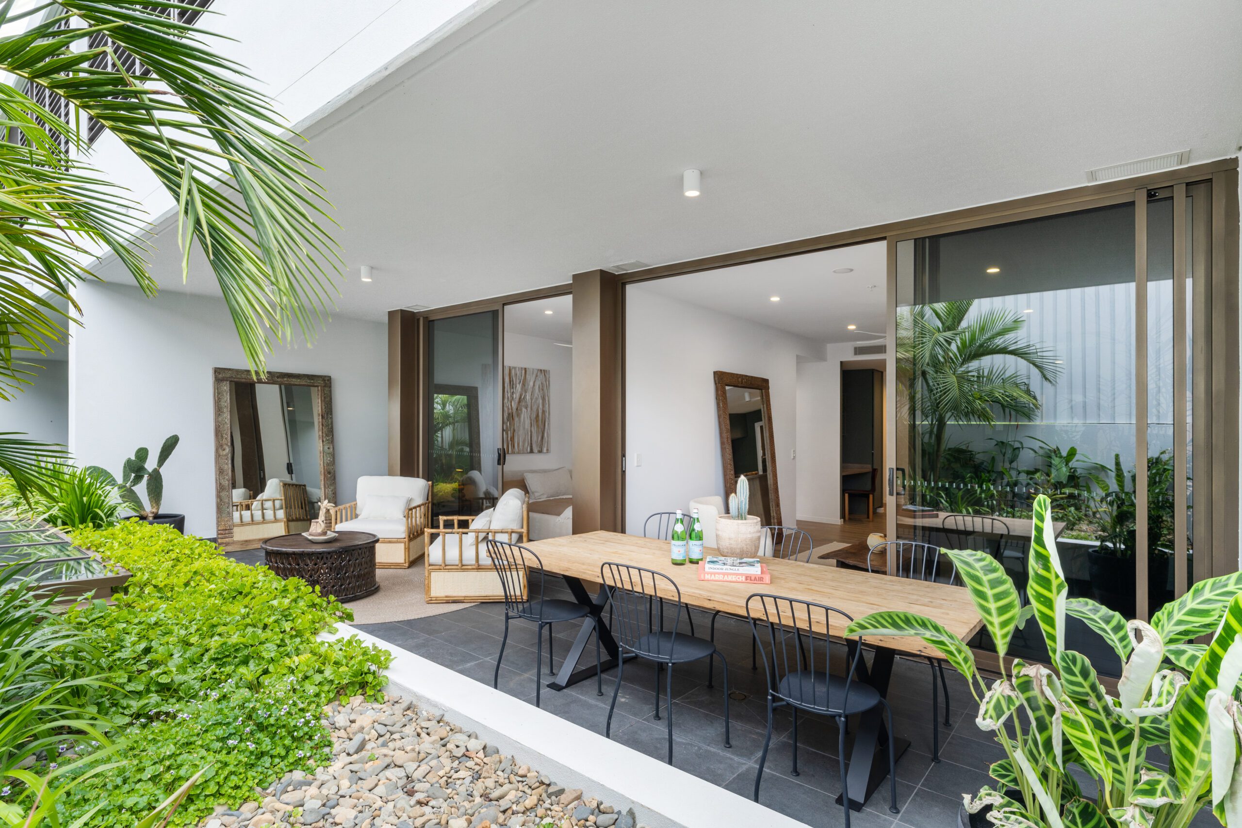 Private terrace with lush tropical gardens and covered for year round outdoor living, dining and entertaining